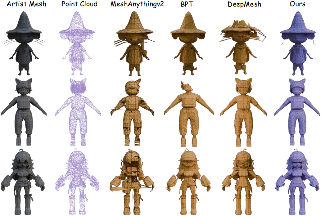 저자들은 메쉬 생성을 일반적인 sequence task로 간주하는 대신 메쉬의 구조를 더 잘 포착하기 위해 Hourglass Transformer 아키텍처를 활용하였다. 본 모델은 입력을 계층적으로 처리하며 두 번의 shorten 연산과 두 번의 upsample 연산을 포함한다. Shorten 연산은 토큰 시퀀스 길이를 줄이고, upsample 연산은 시퀀스를 원래 길이로 확장한다. 이러한 디자인은 모델이 고수준 패턴과 미세한 디테일을 효율적으로 포착할 수 있도록 한다. 포인트 클라우드 기반 메쉬 생성에서 미세하고 복잡한 구조를 구현하려면 강력한 디코더뿐만 아니라 고품질 포인트 클라우드 feature가 필요하다. 이를 위해 Hunyuan3D 2.0에서 사전 학습된 포인트 클라우드 인코더를 사용한다. 이 feature는 cross-attention을 통해 key와 value로 디코더에 입력된다.
