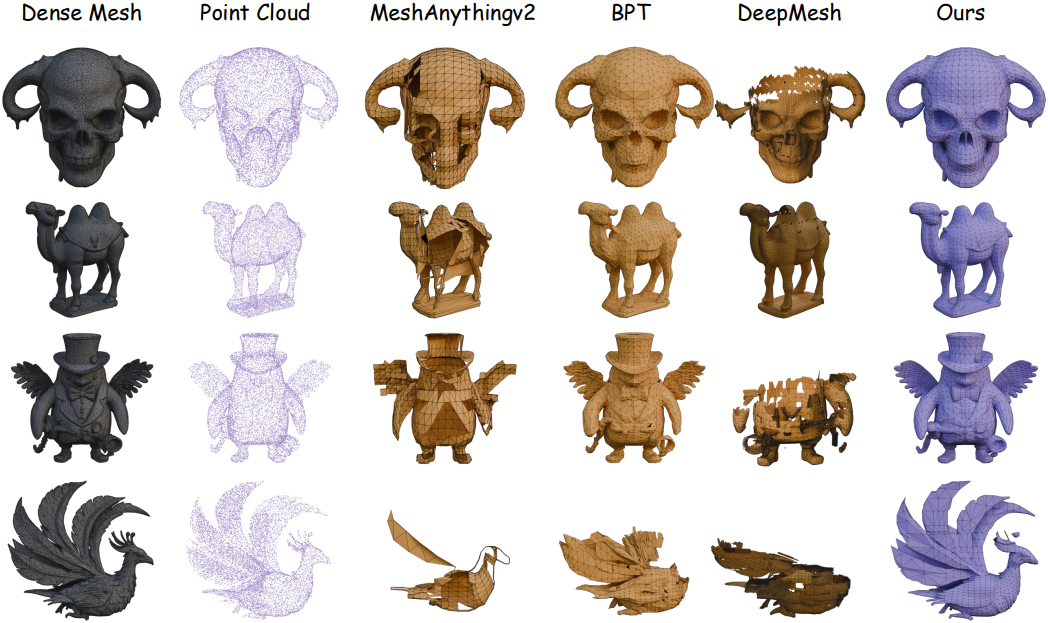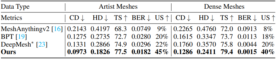 - 메쉬 품질을 객관적으로 정량화하기 어렵다. DeepMesh는 선호도 쌍에 대한 수동 주석에 의존하는데, 이는 비용이 많이 들고 시간이 오래 걸리며 주관적인 편향을 유발하고 학습 데이터를 5,000개 샘플로 제한하여 일반화 성능을 저해한다.