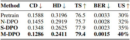 다음은 점수 시스템과 M-DPO에 대한 ablation study 결과이다. N-DPO는 Hausdorff Distance만을 사용한 DPO이고, S-DPO는 본 논문의 점수 시스템을 사용한 DPO이다.