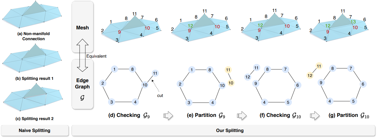이를 해결하기 위해 이 문제를 동등한 edge graph 분할 문제로 변환한다. Vertex $i$의 edge graph \(\mathcal{G}_i\)는 vertex를 포함한 모든 면으로 형성된 무향 그래프(undirected graph)를 나타낸다. (d)에 나와 있듯이, edge graph \(\mathcal{G}_9\)의 “node”는 메쉬에서 기준 vertex 9에 연결된 edge를 나타내고, edge graph의 “edge”는 “node”와 기준 vertex 9에 의해 형성된 메쉬의 면을 나타낸다. 메쉬의 manifold 구조를 보장하기 위해 각 메쉬 vertex의 edge graph는 분기가 없는 사이클 또는 체인 형태여야 하며, 연결 요소가 하나만 있어야 한다.
