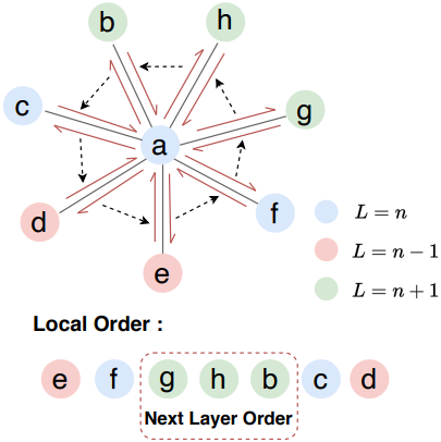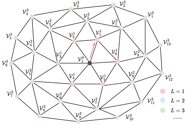 Manifold 메쉬 $\mathcal{M}$과 시작 half-edge가 주어지면 모든 vertex $\mathcal{V}$에 고유한 좌표 $(L, i)$를 할당할 수 있으며, vertex를 \(\mathcal{V}_i^L\)로 표시한다. 시작 half-edge의 두 vertex는 \(\mathcal{V}_1^0\)과 \(\mathcal{V}_1^1\)로 표시한다. Layer 번호 $L$은 $\mathcal{M}$의 edge만으로 초기 vertex \(\mathcal{V}_1^0\)에 대한 최단 경로를 나타내며 BFS 탐색으로 쉽게 얻을 수 있다. Layer order $i$는 같은 layer $L$에 있는 vertex의 순서를 나타내며 layer $L − 1$에 있는 vertex의 로컬한 순서를 기반으로 얻을 수 있다.