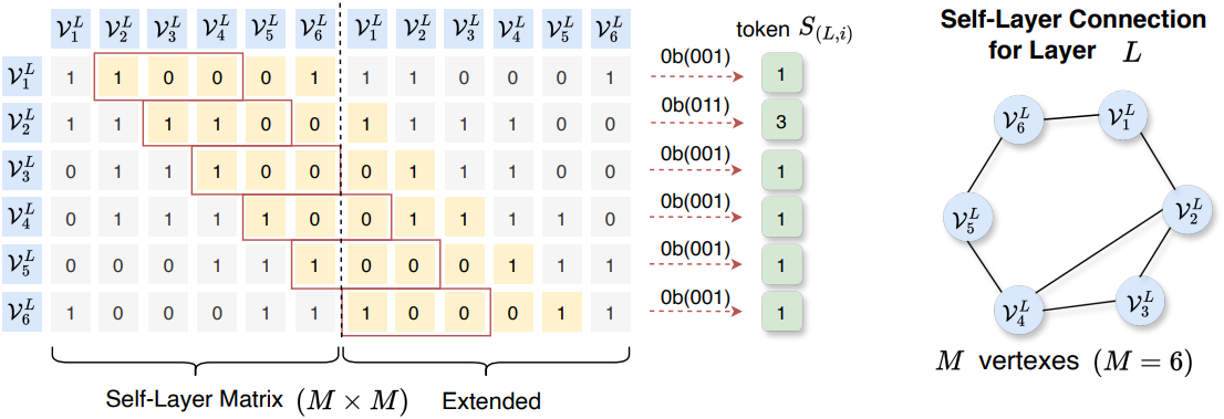 Self-Layer Matrix \(\mathcal{S}_L\)은 $M \times M$의 0-1 대칭 행렬이며, 여기서 $M$은 layer $L$의 vertex 번호를 나타낸다. 목표는 행렬의 $M$개 행을 $M$개의 토큰으로 압축하는 것이다. 여기서 행 $i$의 토큰 인덱스는 $S_{(L,i)}$로 나타낸다. \(\mathcal{S}_L\)을 압축하는 쉬운 방법은 모든 행에 binary coding을 직접 적용하는 것이다. 그러나 토큰의 word table은 $2m$개가 되며, 여기서 $m$은 모든 layer의 최대 vertex 수이다. 이렇게 큰 word table은 허용되지 않지만, 행렬의 sparsity는 효율적인 압축을 위한 단서를 제공한다.