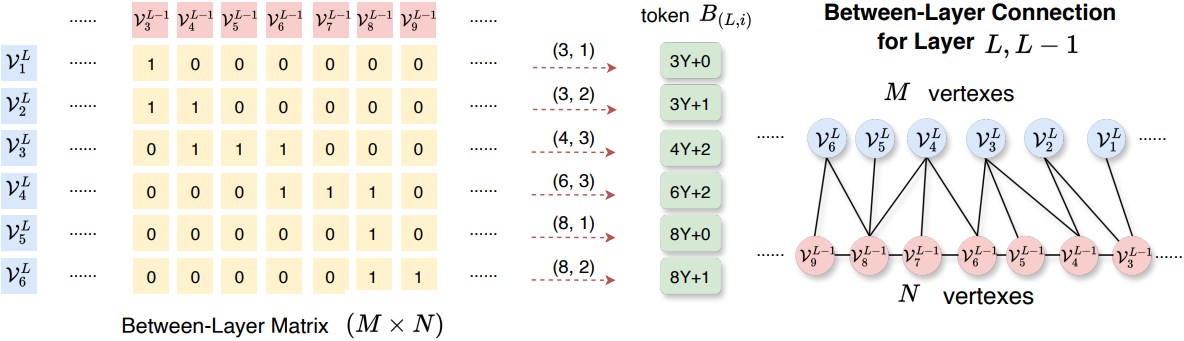 Between-Layer Matrix \(\mathcal{B}_L\)은 크기가 $M \times N$인 0-1 행렬이다. 여기서 $M$은 layer $L$의 vertex 개수이고, $N$은 layer $L-1$의 vertex 개수이다. 연결 규칙이 Self-Layer Matrix와 다르다는 점을 고려하여 다른 압축 방식을 적용한다. “1”은 각 행에 연속적으로 나타나는 경향이 있다. 예를 들어, 행 3의 경우 (3, 4), (3, 5), (3, 6)에 연속된 세 개의 “1”이 있으므로 먼저 행 3을 $(x, y) = (4, 3)$으로 표시한다. 여기서 $x \in [1, m]$은 “1”의 시작 열 인덱스를 나타내고, $y \in [1, Y]$는 연속된 “1”의 개수를 나타내며, $Y$는 미리 정의된 최대로 연속되는 “1”의 개수이다. 그러면 $B_{(L,i)}$의 토큰 인덱스는 $x \cdot Y + y − 1$이어야 한다. 위 그림에 표시된 단순화된 상황에서 Between-Layer Matrix의 word table 크기는 $m \cdot Y$이다.