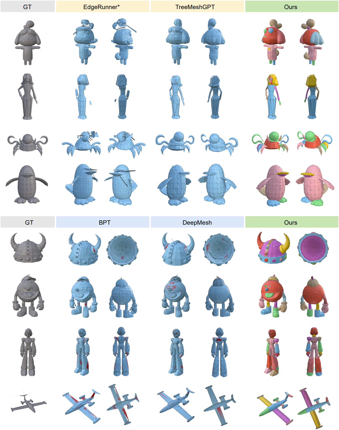 현재 효율적인 mesh-to-token 변환 알고리즘은 크게 트리 순회 기반(ex. EdgeRunner, TreeMeshGPT)과 로컬 패치 기반(ex. BPT, Nautilus, DeepMesh)의 두 가지 카테고리로 나눌 수 있다. 트리 순회 방식은 half-edge 데이터 구조를 활용하여 manifold topology를 보존하지만, 삼각형 순회 중 오차가 누적되어 메쉬 생성이 불안정해지는 문제가 있다. 반면, 로컬 패치 방식은 로컬 삼각형 패치를 독립적으로 처리하여 더 안정적인 메쉬를 생성하지만, 이러한 메쉬는 종종 non-manifold이기 때문에 UV unwrapping, 3D 프린팅, 물리 시뮬레이션 등에 응용하는 데에는 적합하지 않다.