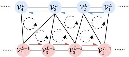Vertex layering 및 정렬 후, 메쉬 vertex의 연결은 self-layer 연결 또는 between-layer 연결의 두 가지 상황으로 분류된다. Self-layer 연결은 연결된 두 vertex가 같은 layer $L$에 속하는 것을 의미하고, between-layer 연결은 연결된 두 vertex가 서로 다른 layer $L$과 $(L−1)$에 속하는 것을 의미한다. 따라서, layer $L$의 vertex가 주어졌을 때, Self-Layer Matrix \(\mathcal{S}_L\)과 Between-Layer Matrix \(\mathcal{B}_L\)이라는 두 인접 행렬을 통해 관련 위상 연결을 설명한다.