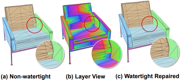 Topology 토큰 예측 오차가 가끔 발생하여 빈틈이 없을 것으로 예상되는 메쉬 표면에 구멍이 생길 수 있다. 본 논문의 메쉬 표현 방식은 본질적으로 watertight 감지 및 복구를 어느 정도 지원한다. 아래 예시는 각 layer의 vertex를 등고선으로 시각화한 것이다. 표면 구멍은 Self-Layer Matrix 또는 Between-Layer Matrix의 특정 entryrk 1이 아닌 0으로 잘못 예측되어 발생하며, 쉽게 감지 및 복구할 수 있다.