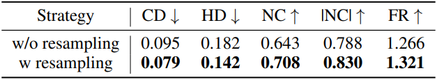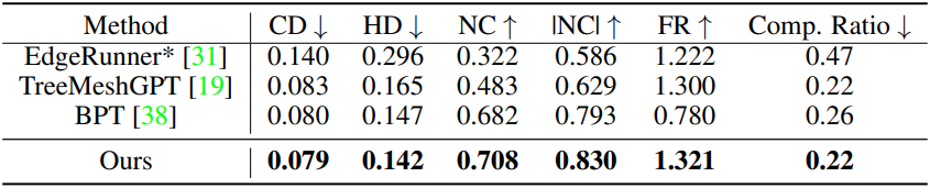 본 논문에서 제안하는 방법을 BPT에서 제안하는 block-wise indexing (vertex당 토큰 3개에서 2개로 줄임)과 결합하면 최종 압축률이 0.26에서 0.22로 향상되어 메쉬 압축 효율을 높이고 동일한 토큰 길이 내에서 더욱 미세한 기하학적 디테일 묘사를 가능해진다. 또한, 메쉬의 연결 요소(connected component)에 대해 개별적으로 연산하고 특수 토큰을 사용하여 표시하기 때문에 메쉬의 연결 요소에 민감하다. 이를 통해 생성 모델은 전반적인 기하학적 위상에 집중하고, 간과되기 쉬운 작은 연결 요소들을 효과적으로 포착할 수 있다. Manifold 기반 메쉬 표현 방식인 본 논문의 접근법은 watertightness를 강력하게 지원하고 표면 normal 일관성에 대한 강력한 제약 조건을 적용하여 뛰어난 기하학적 특성을 보여준다.
