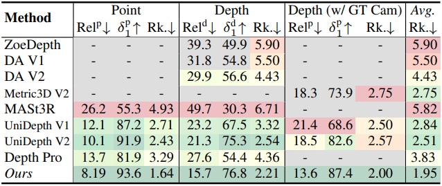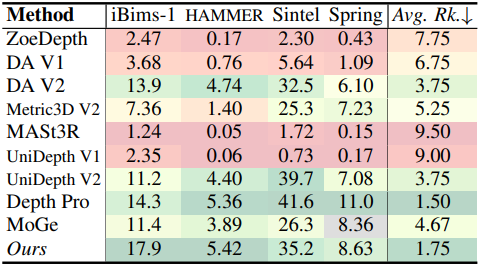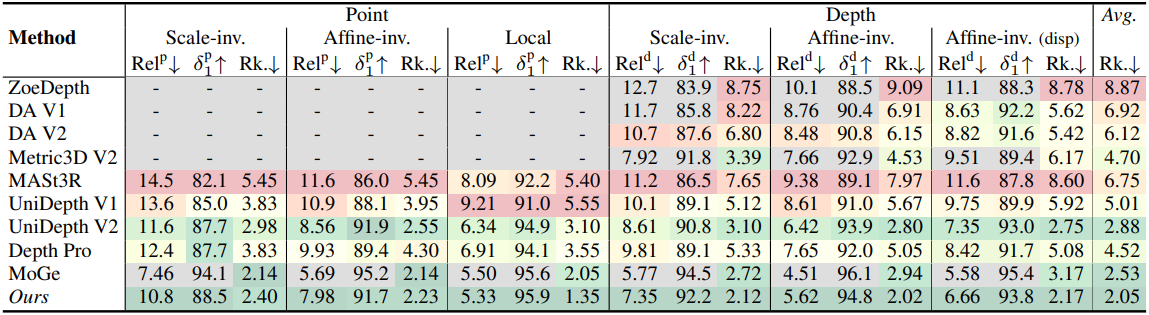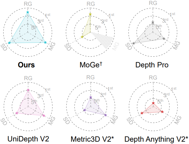 MoGe는 단일 이미지로부터 affine-invariant point map을 예측하고 SOTA geometry 정확도를 달성하였다. 본 논문은 metric geometry 예측 능력을 도입하고 geometry 세분성을 개선하여 복잡한 디테일을 포착함으로써 MoGe를 확장하였다.