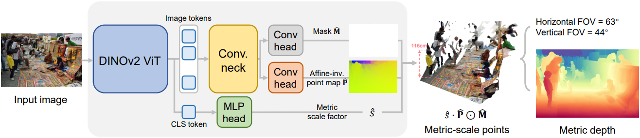- Affine-invariant 표현을 유지하면서 분리된 방식으로 글로벌 metric scale을 추가로 예측