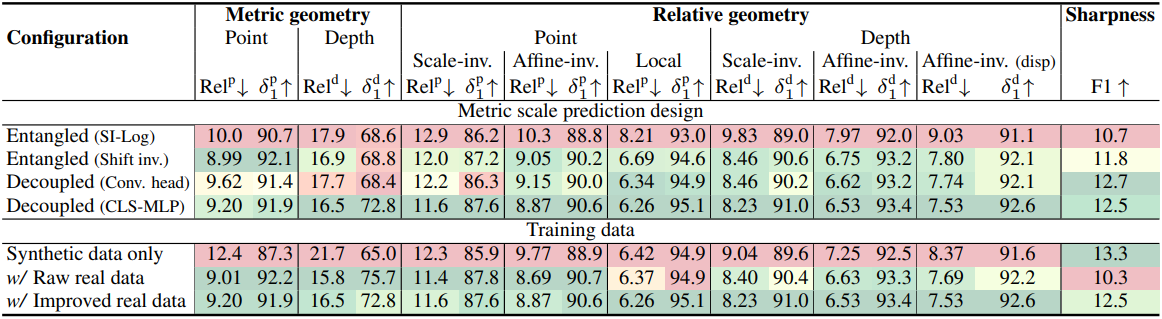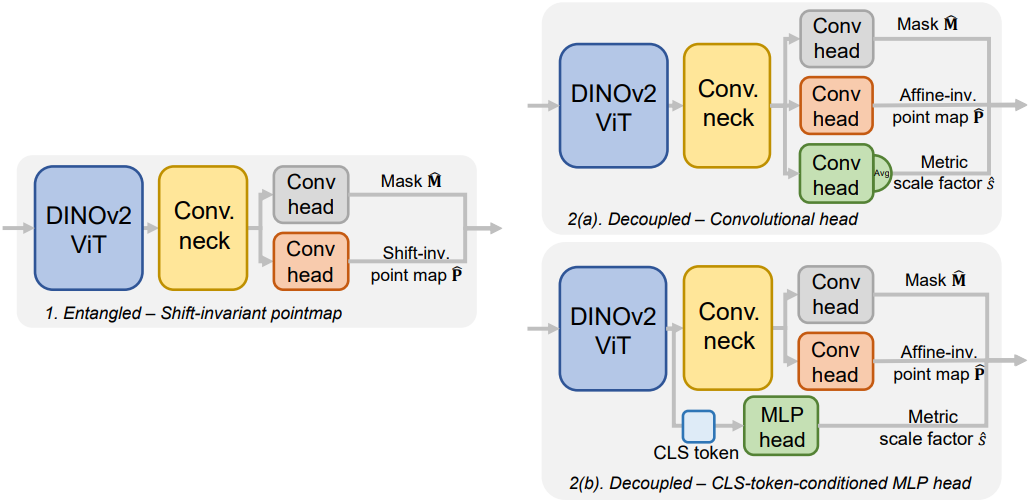 저자들은 MoGe를 metric scale 예측으로 확장하기 위한 두 가지 대안을 탐구했다.