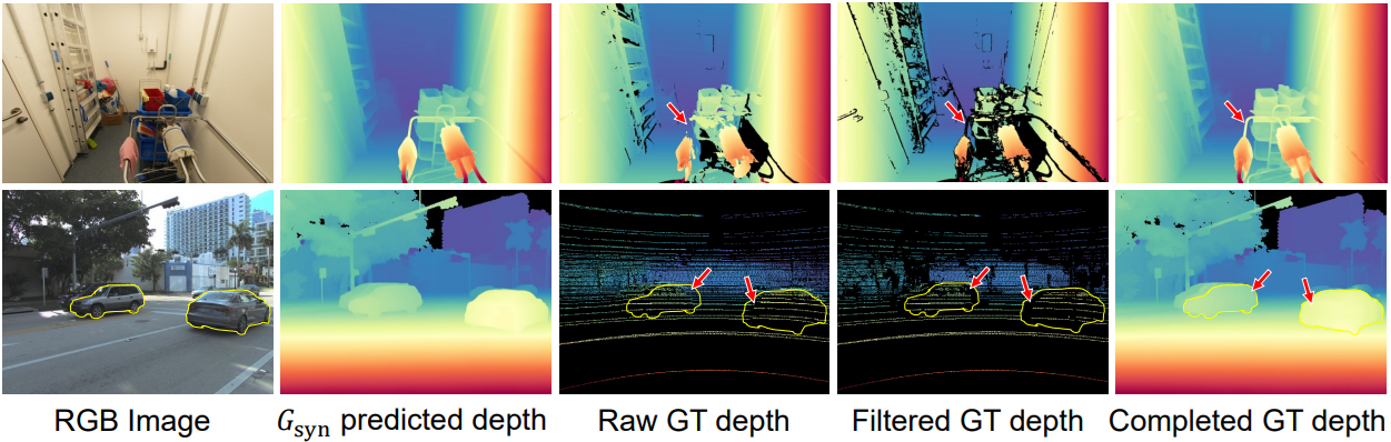 \[\begin{equation} \min \sum_{i \in \mathcal{M}_\textrm{filtered}^c} \| \nabla (\log d_i^c) - \nabla (\log \hat{d}_i) \|^2, \quad \textrm{s.t.} \quad d_i^c = d_i, \forall i \in \partial \mathcal{M}_\textrm{filtered}^c \end{equation}\](\(\mathcal{M}_\textrm{filtered}^c\)는 \(\mathcal{M}_\textrm{filtered}\)가 아닌 영역, \(\hat{d}_i\)와 $d_i$는 각각 \(G_\textrm{syn}\)로 예측한 깊이와 실제 획득한 깊이)