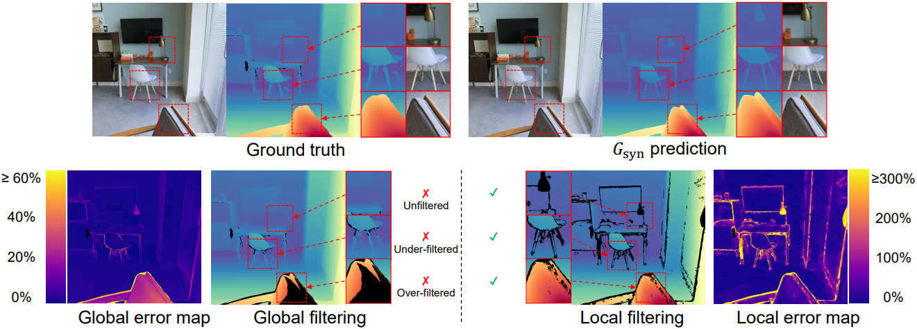 \[\begin{equation} \mathcal{M}_\textrm{filtered} = \mathcal{M} \setminus \left( \bigcup_j \mathcal{O}_j \right) \end{equation}\]예측된 깊이와 실제 데이터를 로컬에서 비교하면 예측된 깊이의 절대적인 편향을 크게 피할 수 있다. 대신 global alignment를 사용하면 잘못된 필터링이 발생할 수 있다.