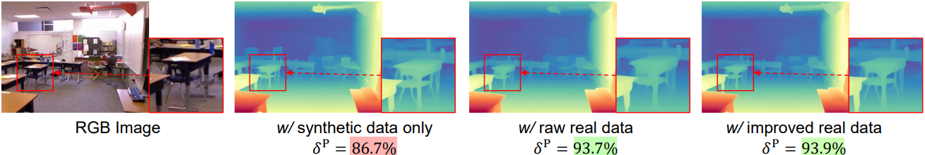 이와는 대조적으로, 본 논문에서는 높은 geometry 정확도를 보장하기 위해 학습 과정 전반에 걸쳐 실제 데이터를 활용한다. 파이프라인은 실제 데이터에서 주로 물체 경계 주변에서 발견되는 불일치하거나 잘못된 깊이 값을 필터링한 후, 합성 데이터로 학습된 모델을 사용하여 깊이 인페인팅을 통해 누락된 영역을 채운다. 이 접근법은 훨씬 더 미세한 디테일을 제공하며, geometry 정확도는 처리되지 않은 전체 실제 데이터로 학습된 모델과 유사하다.