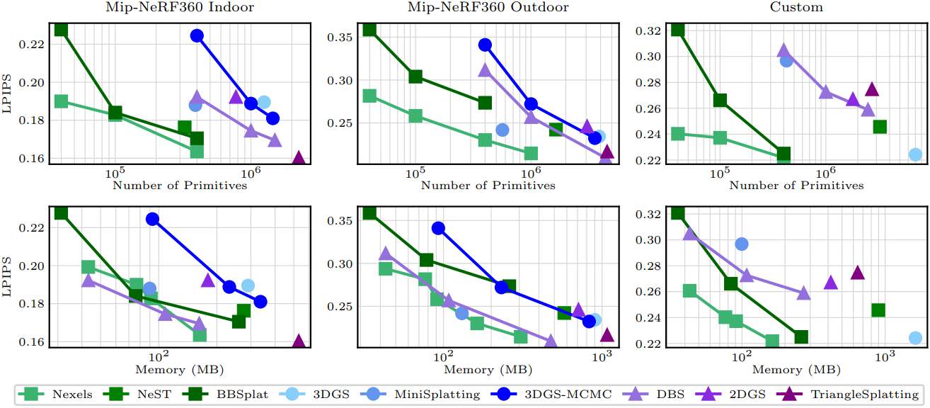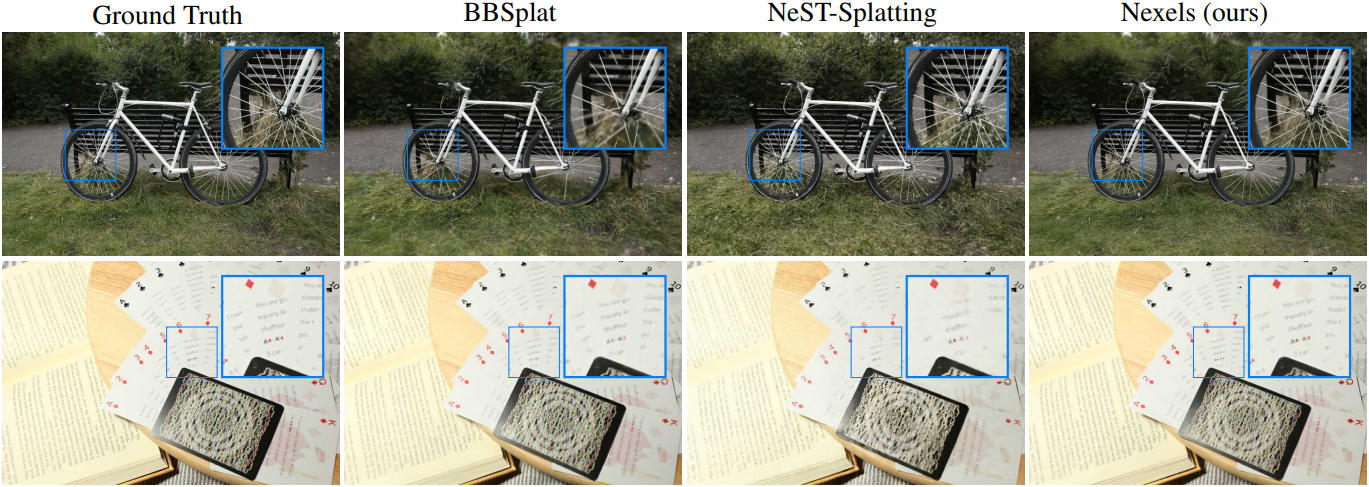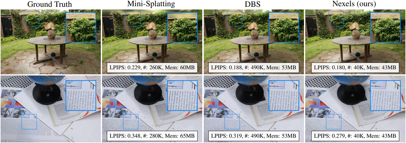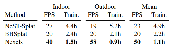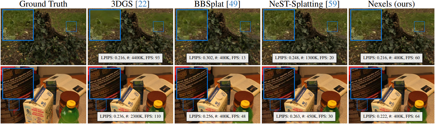 - Nexel은 보이지 않는 영역에서 노이즈를 발생시키는데, 이는 Gaussian splat으로 인한 흐릿한 아티팩트보다 덜 매력적일 수 있다.