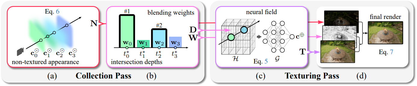 렌더링 단계는 이미지 픽셀에 대한 두 번의 pass로 구성된다. 첫 번째 pass에서는 텍스처가 적용되지 않은 외형만을 사용하여 초기 렌더링을 계산하고 텍스처를 적용해야 하는 primitive에 대한 정보를 수집한다. 두 번째 패스에서는 수집된 ray-primitive 교차점에 신경망 텍스처를 적용하고 초기 렌더링을 업데이트한다.
