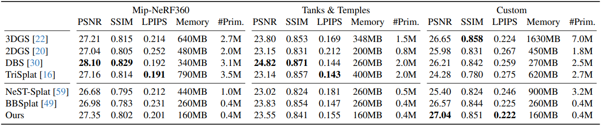 3D Gaussian Splatting (3DGS)은 각 primitive가 geometry와 외형을 동시에 인코딩한다. 이러한 결합은 coarse한 geometry (ex. 사각형)에서도 텍스처링을 통해 세밀한 외형을 표현할 수 있는 기존의 표면 기반 방식과 대조적이다. Gaussian splat은 디테일한 외형을 표현하기 위해 많은 수의 primitive를 필요로 하므로 상당한 메모리 사용량을 초래한다.
