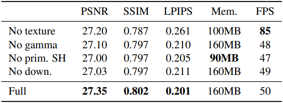 \[\begin{aligned} \mathcal{L} = \mathcal{L}_\textrm{image} &+ \lambda_\textrm{alpha} \mathcal{L}_\textrm{alpha} + \lambda_\textrm{texture} \mathcal{L}_\textrm{texture} \\ &+ \lambda_\textrm{opacity} \mathcal{L}_\textrm{opacity} + \lambda_\textrm{grid} \mathcal{L}_\textrm{grid} \end{aligned}\](\(\lambda_\textrm{alpha} = 0.005\), \(\lambda_\textrm{texture} = 0.5\), \(\lambda_\textrm{opacity} = 0.01\), \(\lambda_\textrm{grid} = 0.01\))