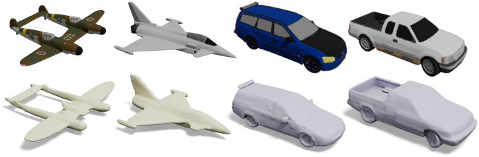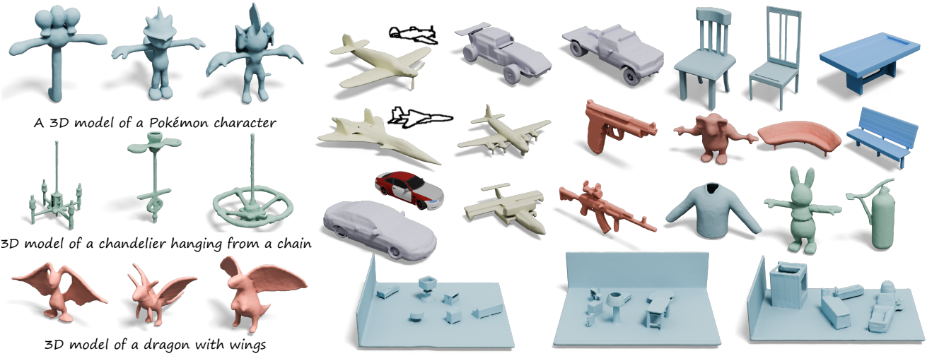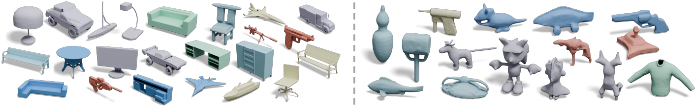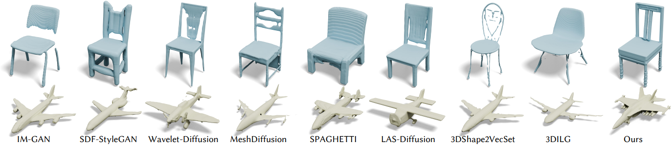 다음은 (왼쪽) ShapeNet 데이터셋과 (오른쪽) Objaverse 데이터셋에 대한 생성 결과이다.