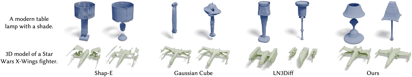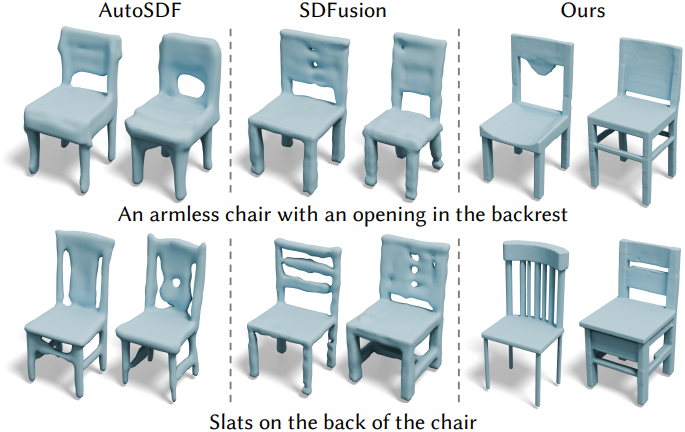 다음은 텍스트 조건부 생성 결과를 비교한 것이다. (위: Objaverse, 아래, ShapeNet)
