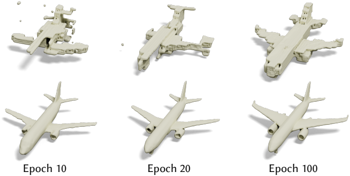 \[\begin{equation} \mathcal{L}_\textrm{sdf} = \frac{1}{N_\mathcal{P}} \sum_{x \in \mathcal{P}} \left( \lambda \| S(x) - D(x) \|_2^2 + \| \nabla S(x) - \nabla D(x) \|_2^2 \right) \end{equation}\]($S(x)$는 예측된 SDF, $D(x)$는 GT SDF, $\mathcal{P}$는 샘플링된 점들의 집합, \(N_\mathcal{P}\)는 샘플링된 점들의 개수)