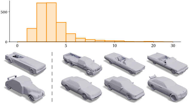 다음은 (위) 생성된 shape들과 학습 데이터 사이의 Chamfer distance (CD) 분포와 (아래) 학습 데이터와 가장 가까운 3개의 생성된 메쉬들이다.