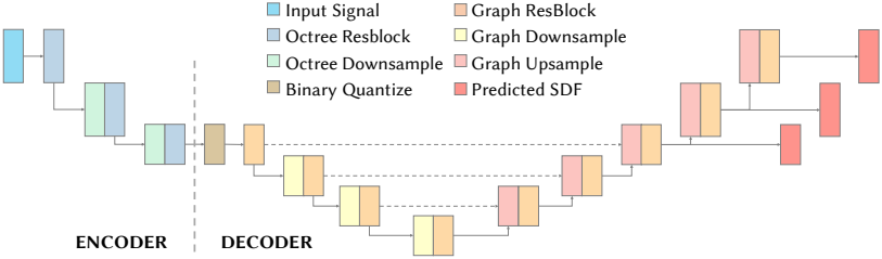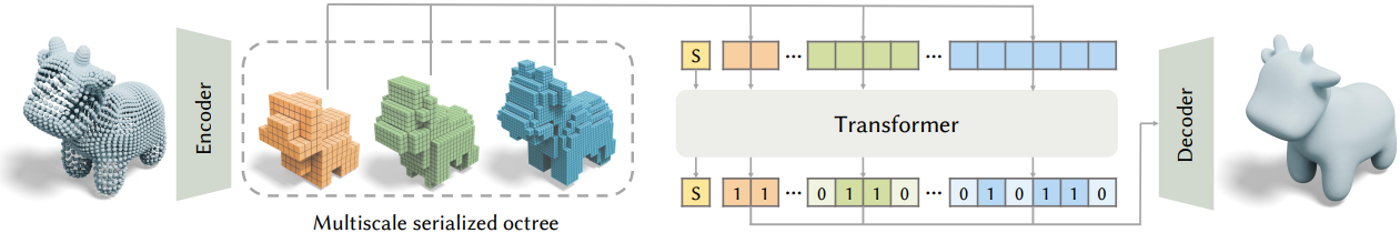 Octree는 shape의 대략적인 geometry를 포착하는 반면, octree 기반 VQVAE는 세밀한 디테일을 인코딩하고 continuous SDF를 재구성하는 역할을 한다. Octree 구조와 quantize된 코드는 모두 바이너리 시퀀스로 serialize되어 autoregressive model의 입력으로 사용된다.