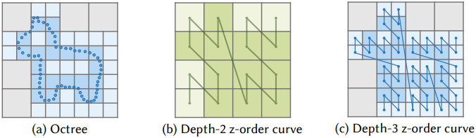 3D shape이 주어지면 먼저 단위 정육면체 안에 맞도록 크기를 조정하고, 지정된 깊이에 도달할 때까지 비어 있지 않은 voxel들을 재귀적으로 세분화하여 octree를 구성한다. 또한, octree의 처음 세 레벨은 전체 부피를 완전히 채우도록 한다. Octree 구조는 각 노드의 분할 상태에 따라 결정되며, 노드들은 무작위로 섞인 키에 따라 z축 방향으로 정렬된다. 특히, z축 정렬 덕분에 공간적 locality가 octree에서 잘 보존된다. 즉, 공간적으로 가까운 octree 노드들은 z축 정렬 곡선에서 인접할 가능성이 높다.