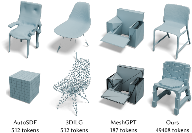 본 논문에서는 serialized octree 표현을 사용하여 autoregressive model을 학습시켜 이를 예측하고, coarse-to-fine으로 점진적으로 3D shape을 생성할 수 있도록 한다. 표준 autoregressive model을 이 표현에 직접 적용하는 것도 가능하지만, 계산 효율이 낮고 최적의 성능을 얻기 어려운 경우가 많다. 이러한 문제점을 해결하기 위해, 저자들은 효율적인 transformer 아키텍처, 맞춤형 위치 인코딩, 다중 토큰 생성 전략을 도입하여 학습 및 생성 효율을 크게 향상시켰다.