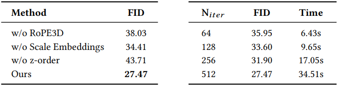 다음은 (왼쪽) 위치 인코딩, z-order와 (오른쪽) 생성 iteration 수에 대한 ablation study 결과이다.