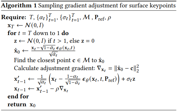 샘플링 프로세스는 각 denoising step에서 보정 gradient 항을 도입한다. 주어진 timestep $t$에 대해 현재 추정 위치 \(\hat{\textbf{x}}_0\)와 타겟 제약 조건을 기반으로 geometry 정보를 고려한 gradient를 계산한다. 그런 다음 이 gradient를 step size $\rho$로 적용하여 점들을 기하학적으로 최적의 위치로 유도한다.