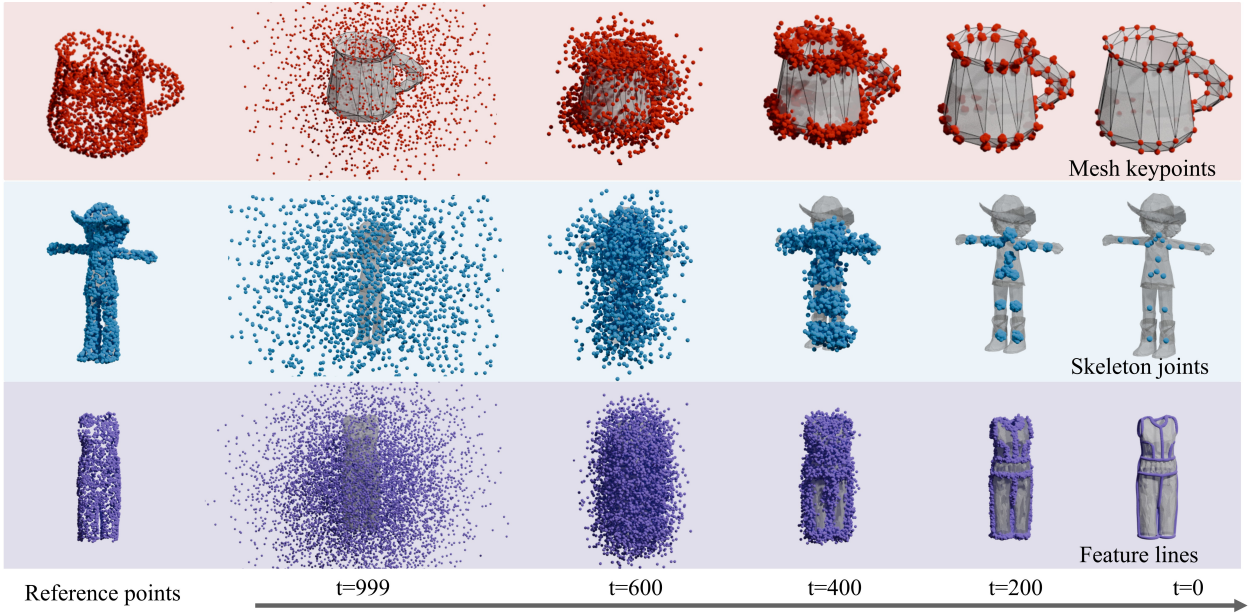 본 논문에서는 diffusion model을 이용한 Point Distribution Transformation (PDT)이라는 새로운 프레임워크를 소개한다. Shape geometry를 나타내는 입력 포인트 클라우드가 주어졌을 때, 본 방법은 입력 포인트 클라우드를 표면 확률 분포에서 추출한 샘플로 간주하여, 점들을 원래 표면 분포에서 semantic하게 유의미한 타겟 분포로 변환하는 방법을 학습시킨다. Keypoint나 feature line과 같은 타겟 점들은 3D 공간에서 별도의 확률 분포로 취급된다. 입력 포인트에 Gaussian noise를 주입하고, 표면 geometry 분포와 타겟 분포를 각 점에 대한 명시적인 guidance를 통해 상관시켜 타겟 점으로 점진적으로 denoising함으로써 두 분포 간의 확률적 매핑을 구축한다.
