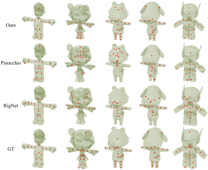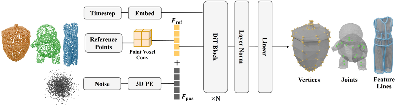 입력 캐릭터 메쉬 $\mathcal{M}$이 주어졌을 때, PDT 프레임워크를 사용하여 볼륨 내에 존재하는 skeletal joint 위치를 예측한다. 입력 메쉬의 표면 샘플 \(\textbf{P}_\textrm{ref}\)를 처리하여, 이러한 외부 점들을 캐릭터의 해부학적 구조를 포착하는 내부 skeletal joint로 변환한다.