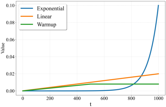 저자들은 이 문제를 해결하기 위해, $t=0$에 가까운 \(\beta_t\) 값이 상당히 작은 exponential schedule을 사용했다. 수정된 schedule은 작은 timestep에서 더 작은 \(\beta_t\) 값을 가지므로 denoising process의 디테일한 부분에 더 많은 노력을 기울인다.