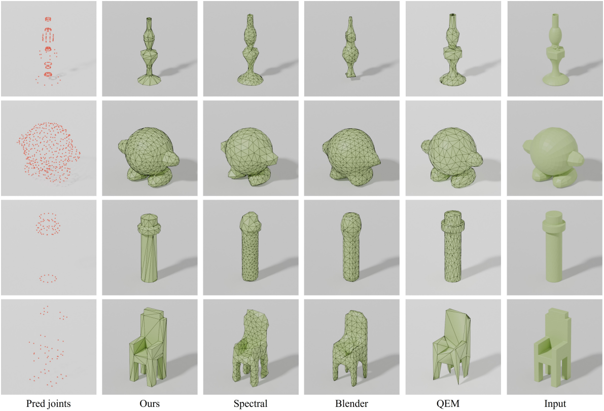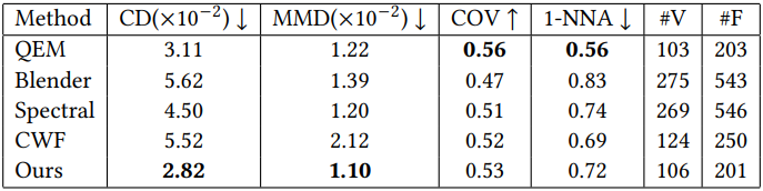 입력 메쉬 $\mathcal{M}$이 주어지면, 먼저 메쉬 표면에서 dense한 레퍼런스 포인트 집합 \(\textbf{P}_\textrm{ref}\)를 샘플링한다. 그런 다음, PDT 프레임워크는 이러한 레퍼런스 점들을 아티스트가 만든 메쉬에서 관찰되는 구조적 특성을 유지하면서 주요 기하학적 특징을 포착하는 포인트 위치 집합으로 변환한다. 이러한 예측 위치는 가장 가까운 표면 삼각형 vertex에 projection되고, 수정된 Quadric Error Metrics (QEM) 단순화 프로세스에서 위치 제약 조건으로 사용된다.