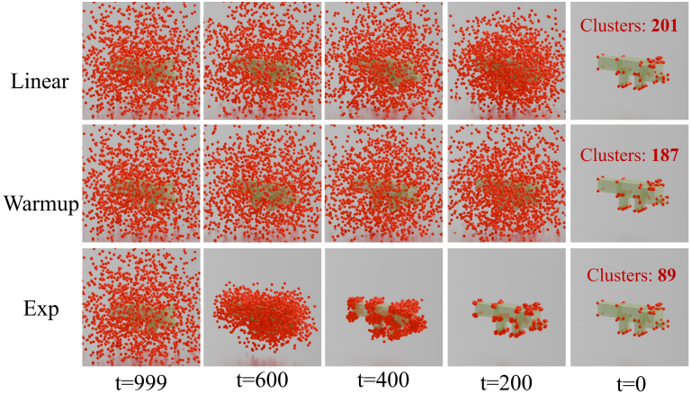 Semantic하게 중요한 점들은 일반적으로 수가 적고 밀집되어 있는 반면, 샘플링 포인트의 수는 상대적으로 많다. 따라서 샘플링 포인트가 소수의 포인트 주변에 조밀하게 클러스터링되는 것이 이상적인 시나리오이다. 그러나 실험 결과, 기존의 noise schedule은 생성된 점들이 타겟 점에 정확하게 수렴하지 않는다. 이러한 현상의 원인은 diffusion process 후반부 ($t=0$에 가까운 timestep)에서 noise level이 상대적으로 높기 때문이다. 이 timestep에서는 생성된 포인트들이 이상적으로는 밀집된 클러스터를 형성해야 한다. 후반 timestep에서 noise 규모가 크면 분산이 과도하게 증가하여 생성된 점들이 정확하게 수렴하지 못하게 된다.