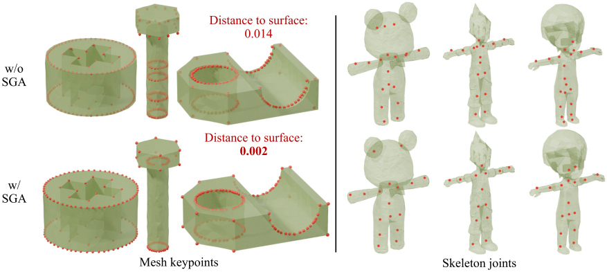 타겟 분포의 특성에 따라 다양한 제약 조건을 적용할 수 있다. 예를 들어, 타겟 분포가 표면에 정렬된 경우 (ex. 메쉬 keypoint), gradient는 점들을 입력 표면 $\mathcal{M}$ 쪽으로 유도하여 생성된 점들이 표면에 가깝게 정렬되도록 한다. Gradient는 각 예측된 점과 가장 가까운 표면 점 사이의 거리를 제곱하여 계산한다. 타겟 점 분포가 표면 내부에 있는 경우 (ex. 내부 skeletal joint), normal 방향 반전과 같은 방향 조정을 사용하여 joint를 중심축에 더 가깝게 유도할 수 있다.