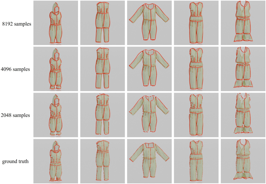 의류 표면에서의 \(\textbf{P}_\textrm{ref}\)가 주어지면, 이러한 입력 포인트를 패턴 사이의 스티치나 경계선과 같은 중요한 구조적 요소를 나타내는 continuous feature line 상의 포인트로 변환한다. PDT는 의미 있는 feature 경로를 따라 위치한 포인트들을 식별하고 연결하는 방법을 학습하여, 로컬 디테일과 전체적인 의류 구조를 모두 포착하는 dense한 선을 생성한다.