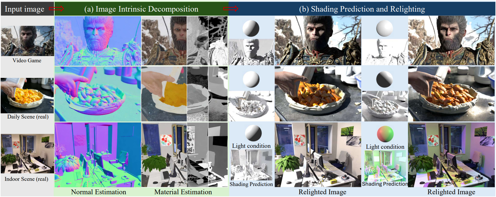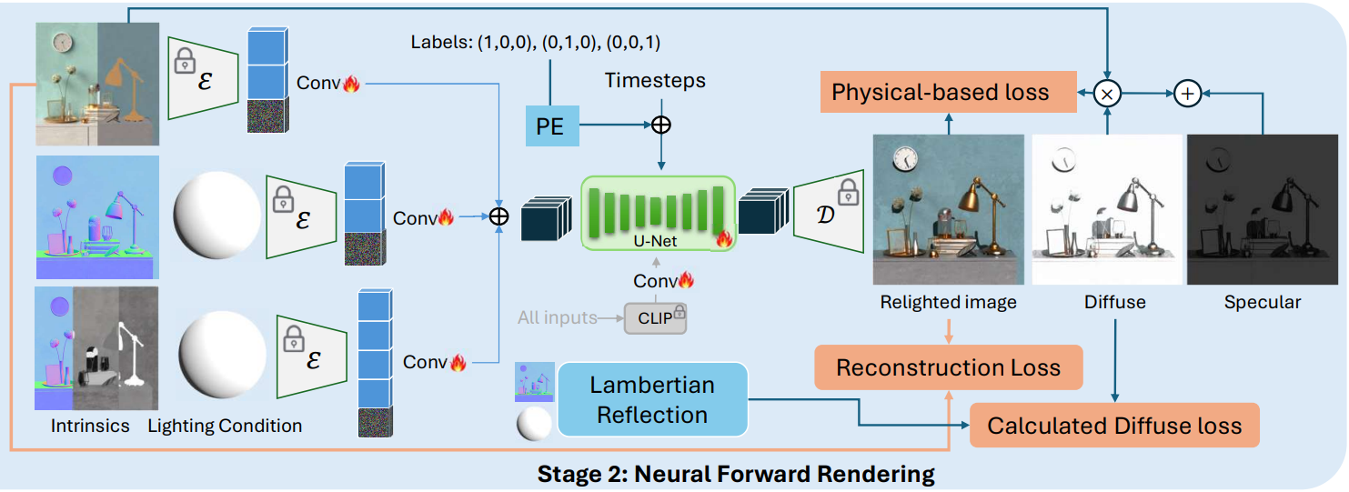 \[\begin{aligned} I_\textrm{in1} &= (I_\textrm{in}, A) \rightarrow I_\textrm{relit} \\ I_\textrm{in2} &= (N, L, m) \rightarrow D_\textrm{pred} \\ I_\textrm{in3} &= (N, L, M, R, m) \rightarrow S_\textrm{pred} \end{aligned}\]이를 통해 모델의 두 번째 batch와 세 번째 batch가 조명과 그림자의 강도 및 구조에 집중하고, 첫 번째 batch는 최종 렌더링 색상에 더 집중하도록 하여 두 번째 batch와 세 번째 batch의 출력이 해당 batch에서 제공된 속성을 더 정확하게 따르도록 한다.