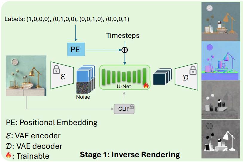 Wonder3D와 GeoWizard에서 영감을 받아, 첫 번째 단계에서는 4개의 batchwise로 concat된 입력 이미지 \(I_\textrm{in} \in \mathbb{R}^{C \times H \times W}\)를 조건으로 하고, albedo $A \in \mathbb{R}^{C \times H \times W}$, normal $N \in \mathbb{R}^{C \times H \times W}$, roughness $R \in \mathbb{R}^{C \times H \times W}$, metallic $M \in \mathbb{R}^{C \times H \times W}$를 동시에 예측한다. 입력 조건들의 CLIP 이미지 임베딩은 cross-attention layer에도 입력된다. 표준 self-attention layer는 global-aware하도록 확장되어 batch 간 통신이 가능하다.