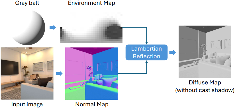 Normal map을 이용한 조회 기반 샘플링을 통해 그림자가 포함되지 않은 diffuse map을 얻는다.