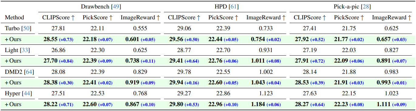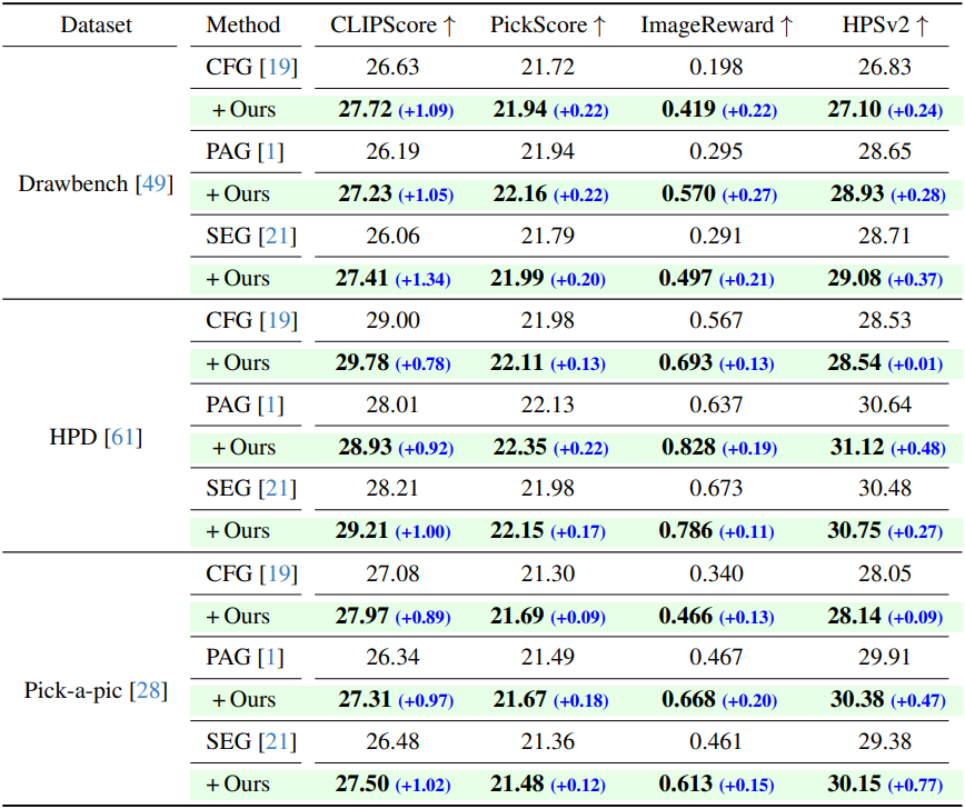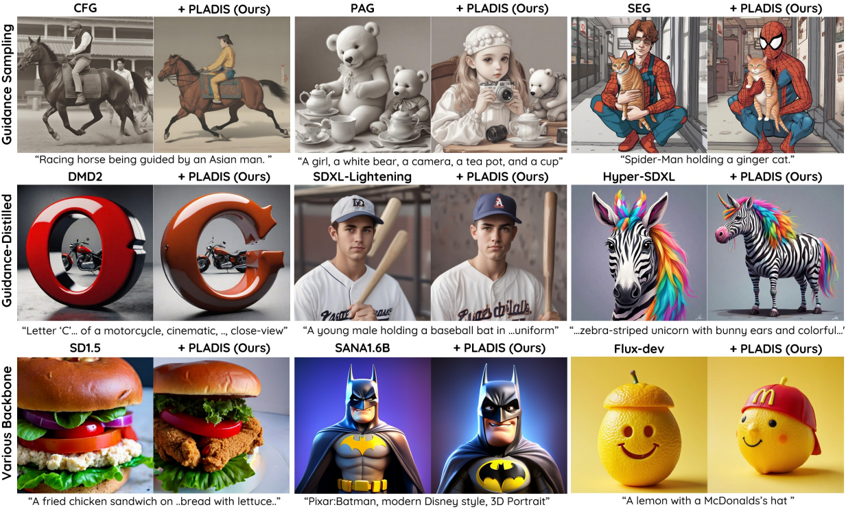 이를 바탕으로, 본 논문은 sparse attention과 dense attention 간의 차이에 가중치를 부여하여 sparsity를 강조하는 새롭고 간단한 방법인 PLADIS를 제안하였다. PLADIS는 앞서 언급한 문제점들을 효과적으로 해결하여 성능 향상과 텍스트-이미지 정렬 개선을 가져왔다.