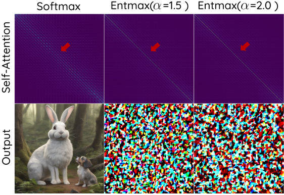 T2I diffusion model에서 sparse attention 메커니즘의 효율성을 평가하기 위해, 저자들은 먼저 표준 self-attention을 $\alpha = 1.5$와 $\alpha = 2.0$의 $\alpha\textrm{-Entmax}$로 대체했다. Self-attention의 경우 $\alpha\textrm{-Entmax}$ 대부분의 entry가 대각선을 따라 집중되는 것이 관찰되었다. 이러한 현상으로 인해 각 패치는 주로 자기 자신에게만 집중하게 되어 픽셀 간 상호 작용이 심각하게 제한되고 궁극적으로 이미지 생성에 실패하게 된다.