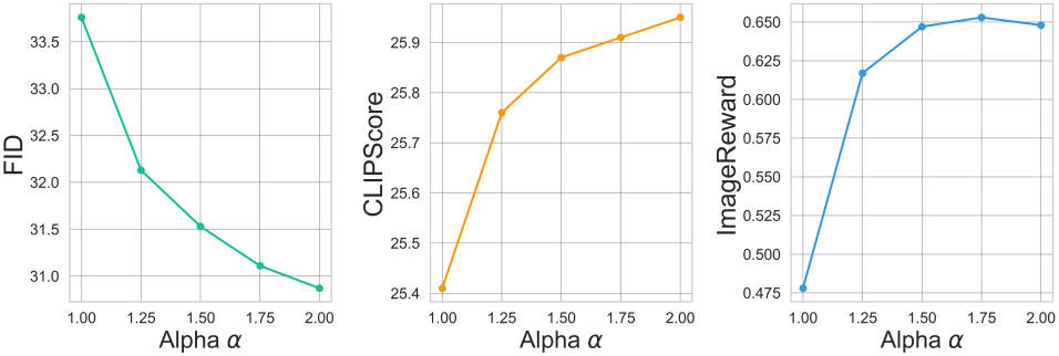 흥미롭게도, 추가 학습 없이도 $\alpha$ 값이 높아질수록, 즉 sparsity가 높아질수록 생성 품질, 텍스트 정렬, 그리고 인간 선호도 점수가 향상되었다. Sparse cross-attention은 sparse한 정렬을 생성하여 이미지와 텍스트 임베딩 간의 더욱 엄격한 일치를 보장한다. 이는 전반적인 성능 향상으로 이어진다.