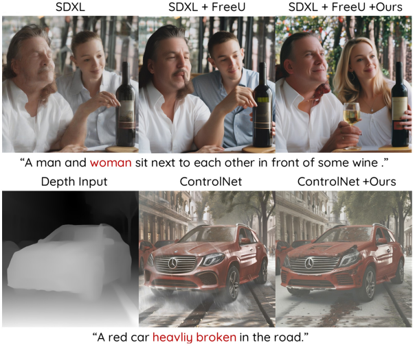 다음은 FreeU 및 ControlNet과 비교한 결과이다.