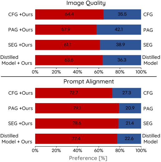 다음은 텍스트 정렬 및 인간 선호도 데이터셋에서 다양한 guidance 방법들과 비교한 결과이다.