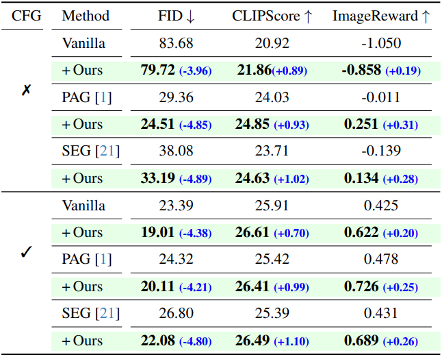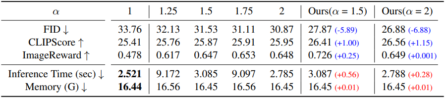 구체적으로, inference 과정에서 cross-attention을 sparse attention으로 대체한다. 추가적인 inference 시간을 필요로 하는 self-attention을 통해 모델을 약화시키는 대신, cross-attention 메커니즘을 수정함으로써 추가 inference의 필요성을 없앨 수 있다. 이는 다른 guidance 샘플링 방법 및 guidance-distilled model과의 호환성을 보장한다.