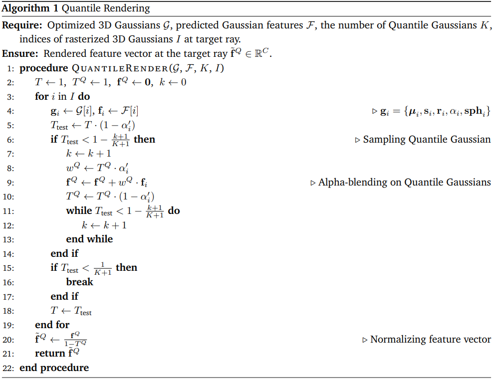 먼저, 3D Gaussian을 rasterization하고 splatting하여 각 픽셀 광선 $\vec{p}$에 대한 3D Gaussian 인덱스 $I$를 얻는다. 그런 다음, Q-Render는 Quantile Gaussian 샘플링, 알파 블렌딩, feature 정규화의 세 가지 하위 단계를 실행하여 각 광선을 따라 $K$개의 Quantile Gaussian을 샘플링한다 ($K$는 hyperparameter).