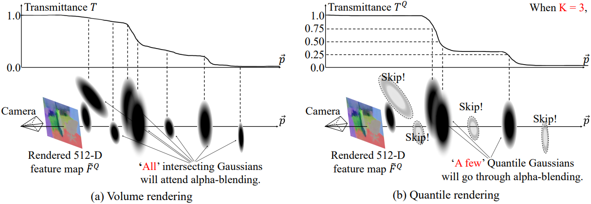 저자들은 모든 Gaussian이 영향력이 있는 것은 아니며, 3D Gaussian 중 일부만이 광선을 따라 고차원 feature 렌더링에 의미 있는 영향을 미친다는 가설을 세웠다. 이를 토대로 고차원 Gaussian feature를 위한 효율적인 렌더링 알고리즘인 Quantile Rendering (Q-Render)를 개발했다. Q-Render는 rasterization된 모든 3D Gaussian을 촘촘하게 누적하는 대신, 광선의 투과율 프로파일을 지배하는 소수의 Quantile Gaussian들을 적응적으로 선택하여 이러한 Quantile Gaussian만을 렌더링한다. 이러한 quantile 기반 선택은 중복 계산을 줄이고, 고차원 feature map 렌더링이 필요한 후속 task에 필요한 원본 신호를 근사화한다.