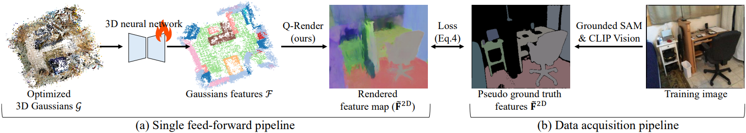 최적화된 3D Gaussian \(\mathcal{G} = \{\textbf{g}_i\}_{i=1}^N\)이 주어졌을 때, 3D 신경망은 $C$차원의 Gaussian feature \(\mathcal{F} = \{\textbf{f}_i\}_{i=1}^N\)을 예측한다. 본 논문에서 제시하는 Quantile Rendering을 통해, Gaussian feature는 $C$차원의 feature map으로 렌더링된다. 3D 신경망은 렌더링된 feature map과 CLIP의 비전 인코더에서 추출한 2D feature map 간의 렌더링 loss를 최소화하도록 학습된다.