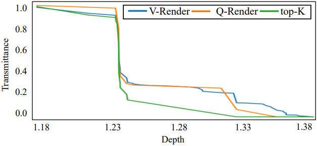 위 그림에서 볼 수 있듯이, Q-Render는 볼륨 렌더링에서 투과율 경향을 잘 근사하는 반면, top-$K$ 샘플링 전략은 다른 경향을 보인다. Q-Render는 오버헤드를 줄이면서 효율성과 정확도 모두에서 top-$K$보다 우수한 성능을 보여준다.